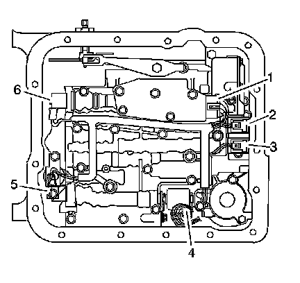 3. Verify that the manual valve link (3) is installed properly to the inside detent lever (1) and the manual valve (2).