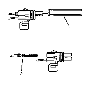 4. Insert the Weather Pack(R) terminal removal tool into the front (mating end) of the connector cavity until it rests on the cavity shoulder (1).