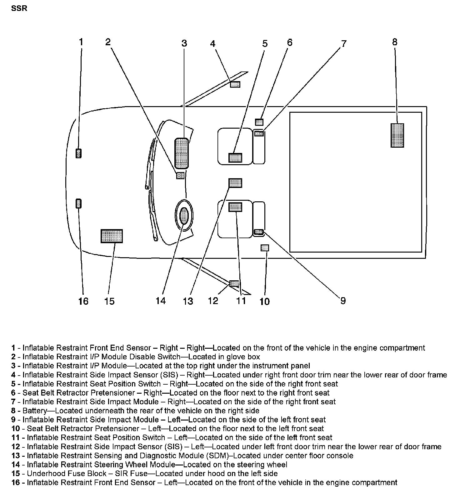 The SIR Zone Identification Views shown illustrate the approximate location of all SIR components available for the vehicle. This will assist in determining the appropriate SIR Disabling and Enabling Zones for a given service procedure, refer to SIR Disabling and Enabling Zones.