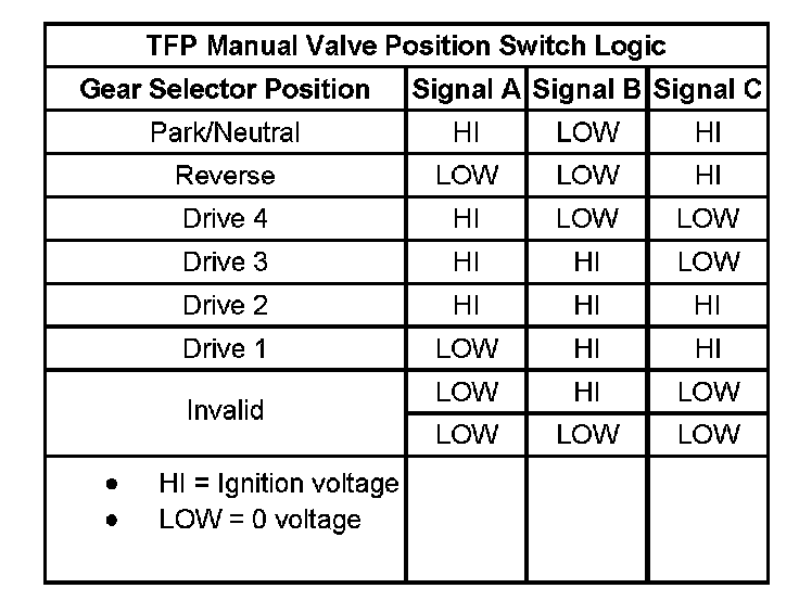 Transmission Fluid Pressure (TFP) Manual Valve Position Switch Logic: