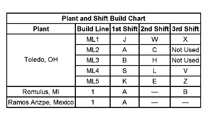 12 - Build Location Y=Toledo, OH, R=Romulus, MI, 4=Ramos Arizpe, Mexico