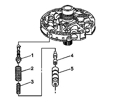 6. Remove the pressure regulator isolator spring (3) and the pressure regulator valve spring (2).