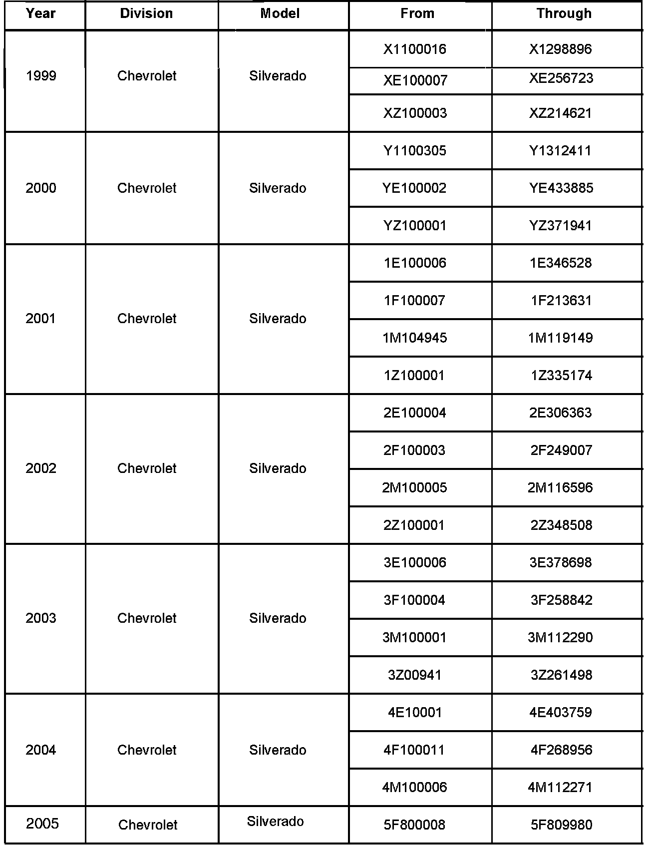 Involved are certain 1999-2002 Chevrolet Silverado and GMC Sierra 1500 Series, and 2001-2005 Chevrolet Silverado and GMC Sierra 2500/3500 Series vehicles equipped with a manual transmission and built within the VIN breakpoints shown.