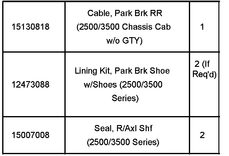 2500-3500 Series - Dealers are to inspect the parking brake lining thickness on both rear brakes and install a new rear right-hand parking brake cable assembly. Also, depending on the amount of lining remaining, install new parking brake shoes (both rear brakes).