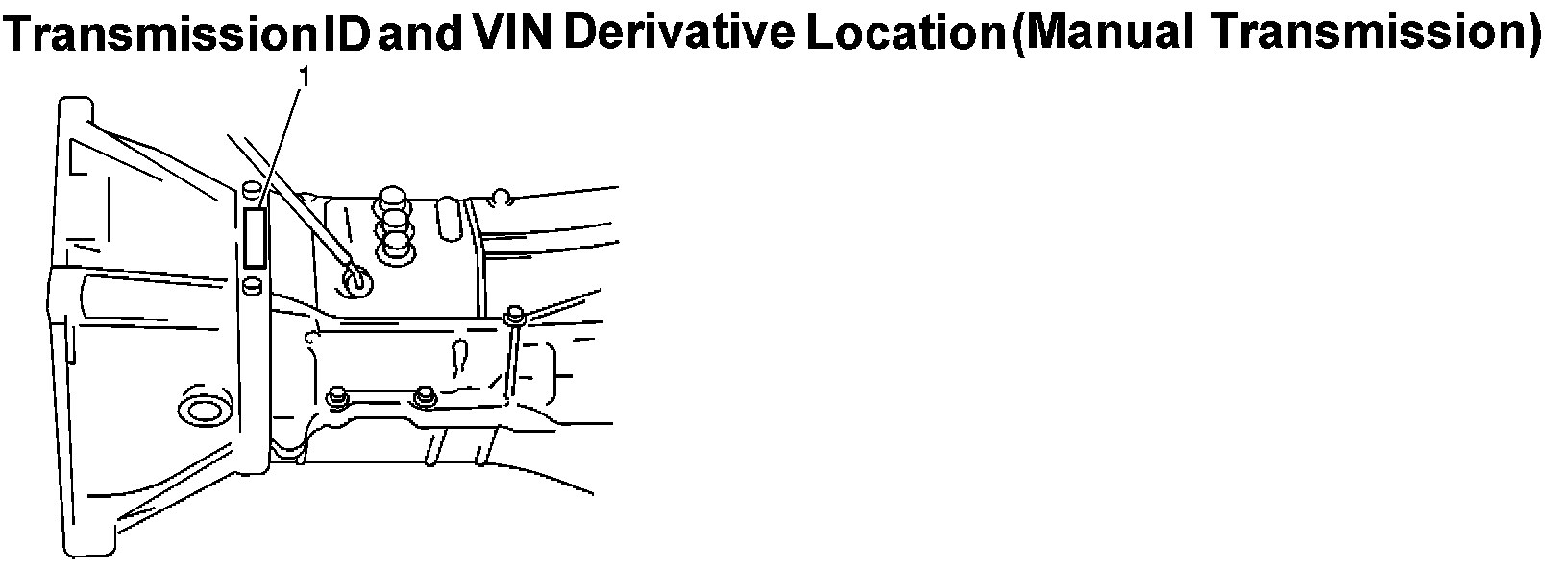 The manual transmission model identification is located on a label or tag or stamped or etched on the transmission case (1). If this label is missing or unreadable, use the service parts identification label in order to identify the vehicle's transmission.