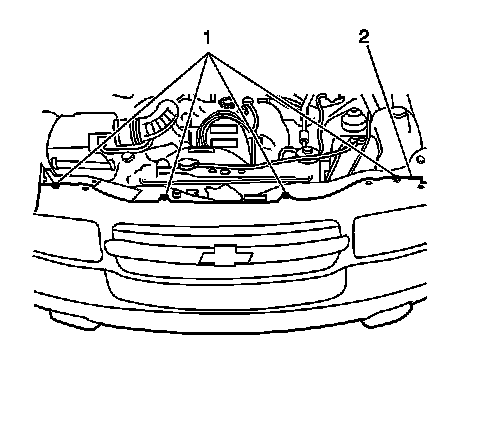 1. Remove the 4 plastic retainers (1) from the top of the radiator grille (2).