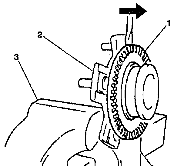 2. Remove the ABS reluctor ring (1) from the wheel hub (2) by prying the ring away from the hub.