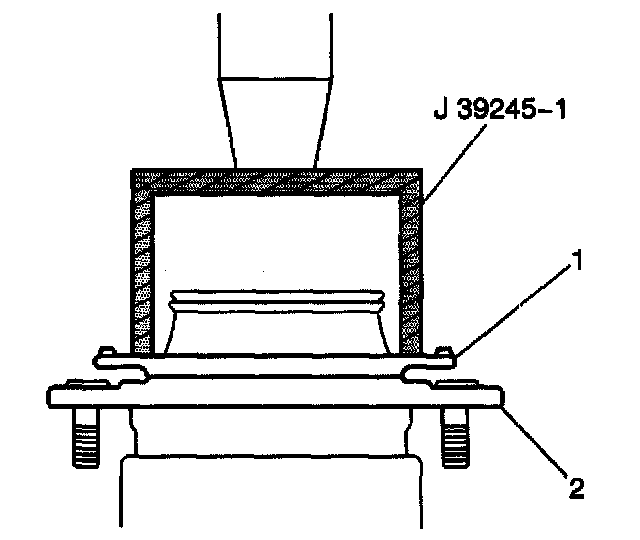 1. Using J 39245, press the ABS reluctor ring (2) onto the wheel hub.