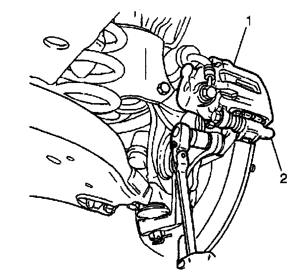 5. Remove the 2 mounting bolts, the caliper (1), and the caliper bracket (2).