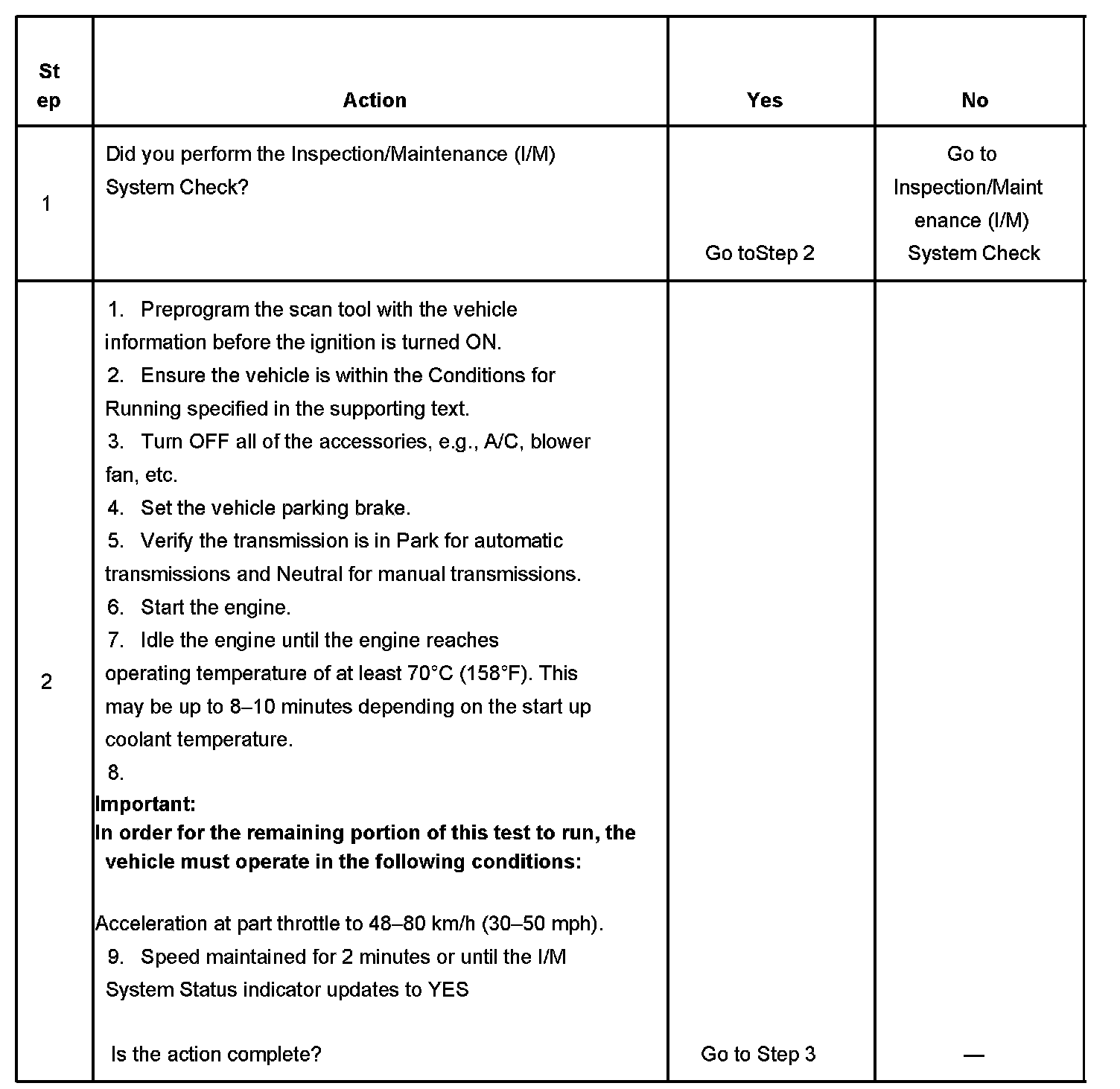The scan tool can be used to monitor each of the I/M System Status indicators during the I/M Complete System Set Procedure. When all of the indicators for a test step have updated to YES, testing can move on to the next step even if the remaining portion of the test is not complete. For example, step 3 is designed to run the Catalyst Test. The procedure instructs the technician to operate the vehicle in the enable conditions for 6 minutes. If the test updates to YES within 4 minutes, it is not necessary to continue with the enable conditions and testing can advance to the next step.