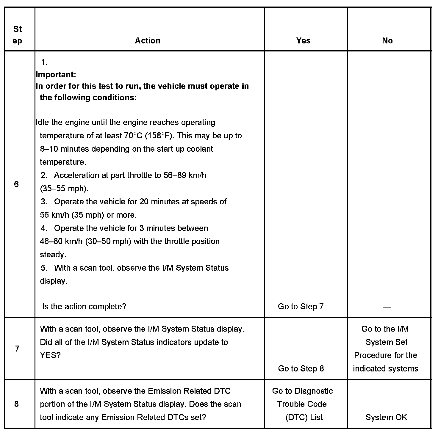 8. The I/M System Status only reports on whether or not a diagnostic has run, not the outcome of the test. If any emission related DTC sets after the tests are complete, the DTC will require diagnosis.