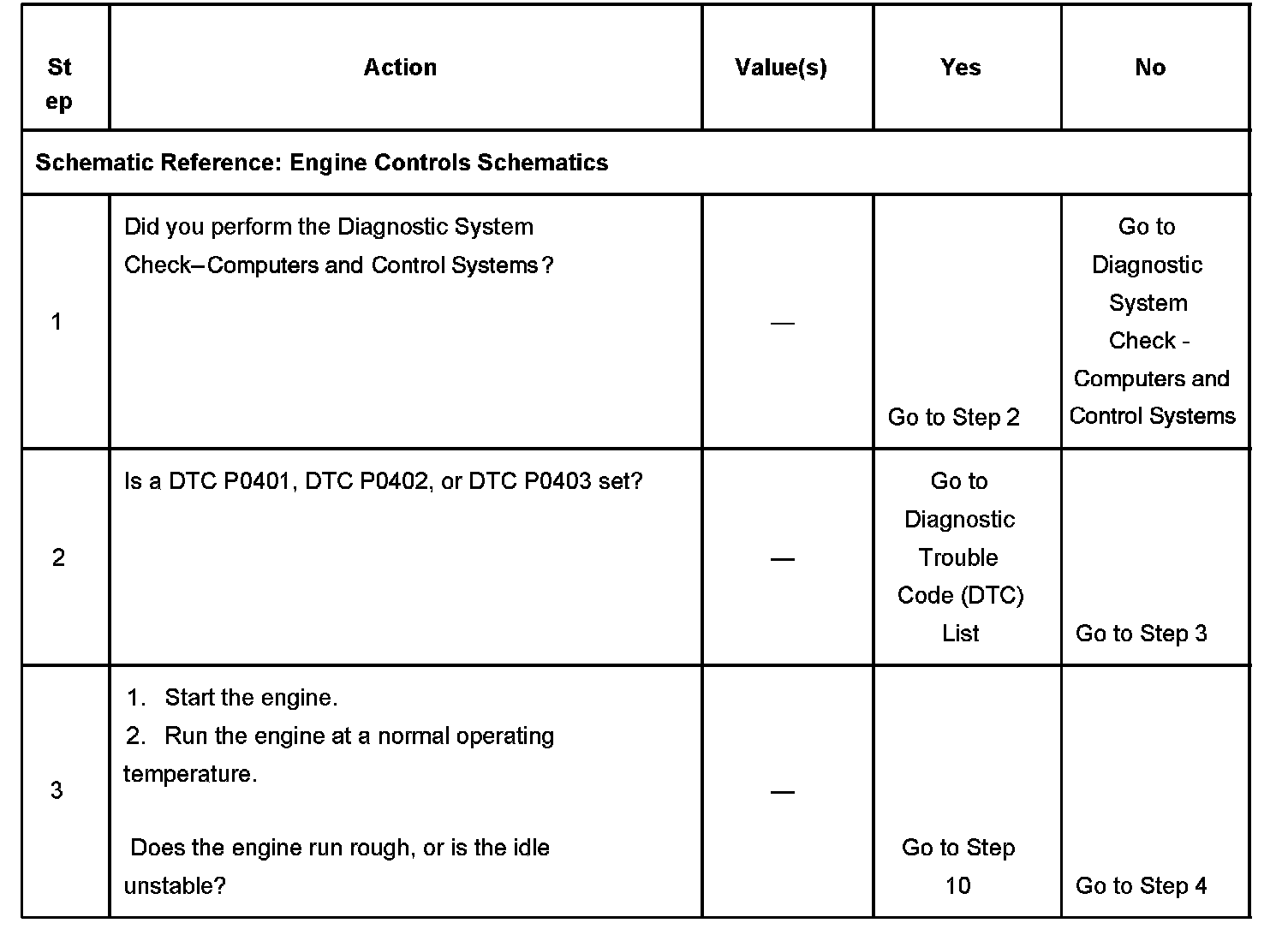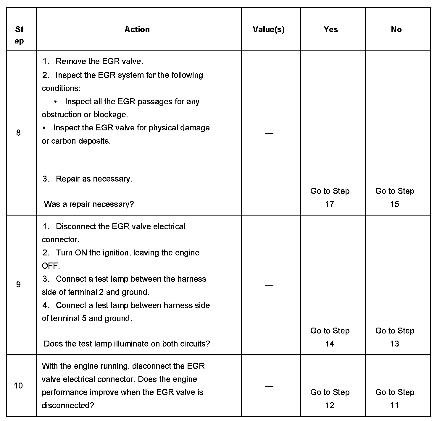 10. This step determines whether an electrical fault is the cause of the EGR valve staying open. A grounded EGR valve control circuit can cause the EGR valve to be open all the time.