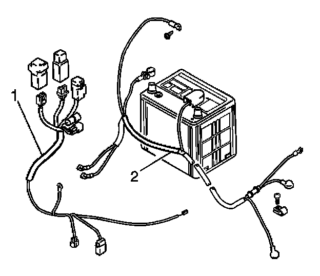 - Both the positive and negative battery cables are serviced as one harness assembly (2).