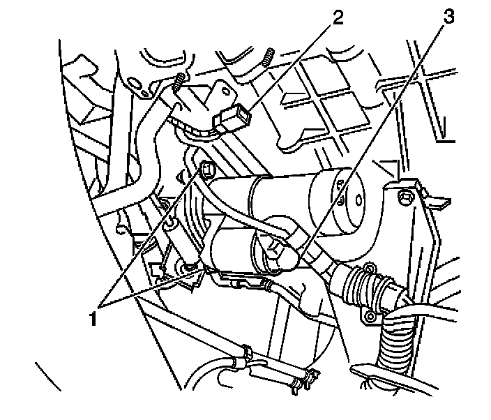 2. Install the starter upper mounting bolt (1) and the ground wire.