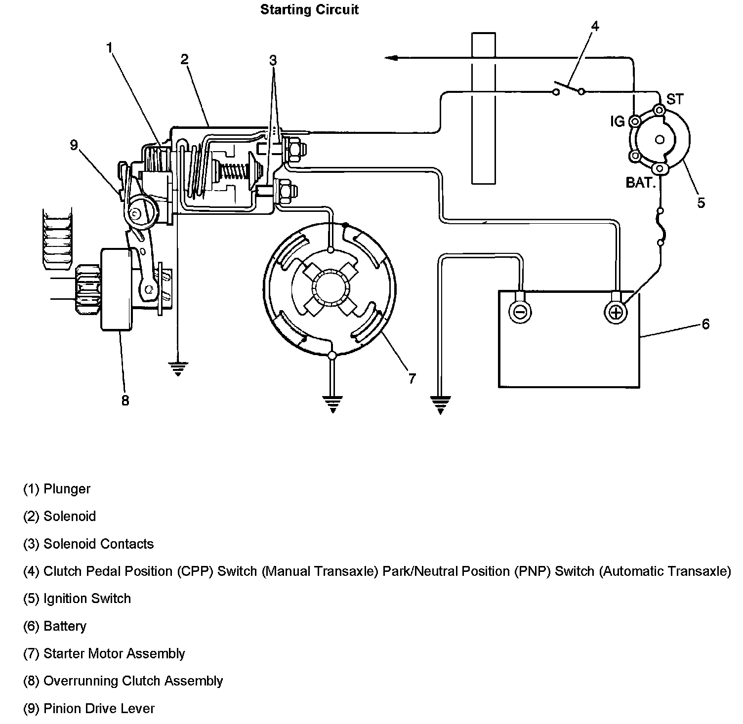 Moving the ignition switch to the CRANK position closes the circuit to both the pull-in and hold-in windings. The transmission range switch or the clutch pedal position (CPP) switch are in series with, and must be closed, in order for voltage to reach the starter solenoid S terminal. Moving the ignition switch to the CRANK position also sends a 12 V signal to the PCM.