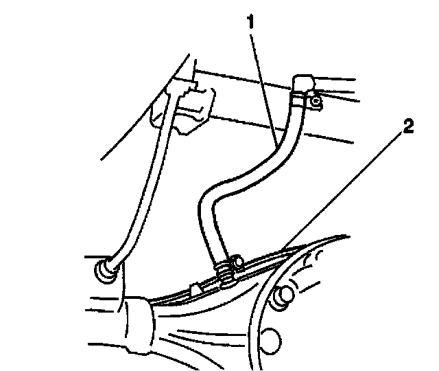 8. Install the rear axle breather hose (1) the rear axle housing (2). Secure the breather hose with the clamp.
