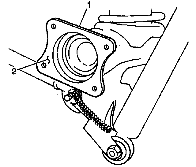 15. Apply the General Motors Sealer GM P/N 1052366, or the equivalent (2), to the rear axle housing brake backing plate flanges (1).