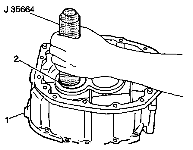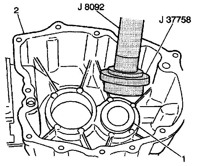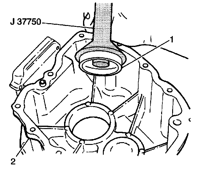 2. Use the J 37750 and a hammer in order to install a new rear case oil seal (1) into the rear case (2).