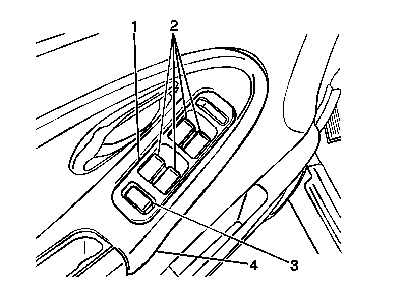 The master switch (1) contains one switch (2) for each window and is located on the left front door trim panel (4).