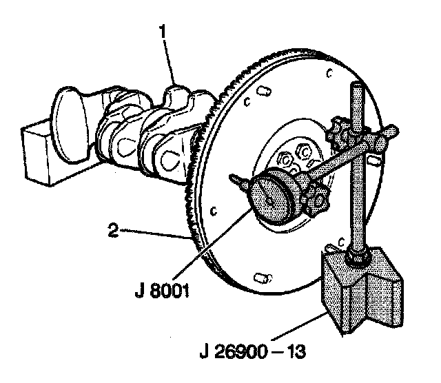 3. Measure the flywheel face runout using a J 8001 with a J26900-13. Replace the flywheel if the runout exceeds specifications.