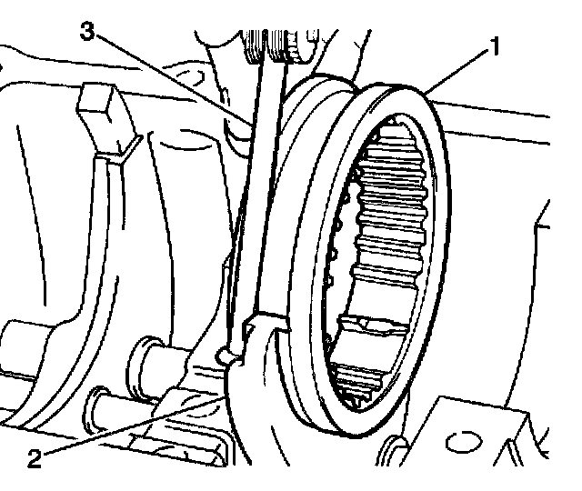 11. Use a feeler gage (3) in order to measure the clearance between the gearshift fork (2) and the synchronizer sleeve (1). If the clearance exceeds 1.0 mm (0.039 inch), replace the fork (2) and the synchronizer sleeve (1) as necessary.