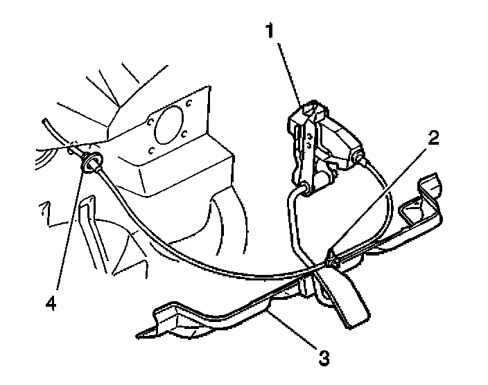 1. Install the cruise control servo cable to the vehicle. Secure the cable with the retainer (2) and the grommet (4).