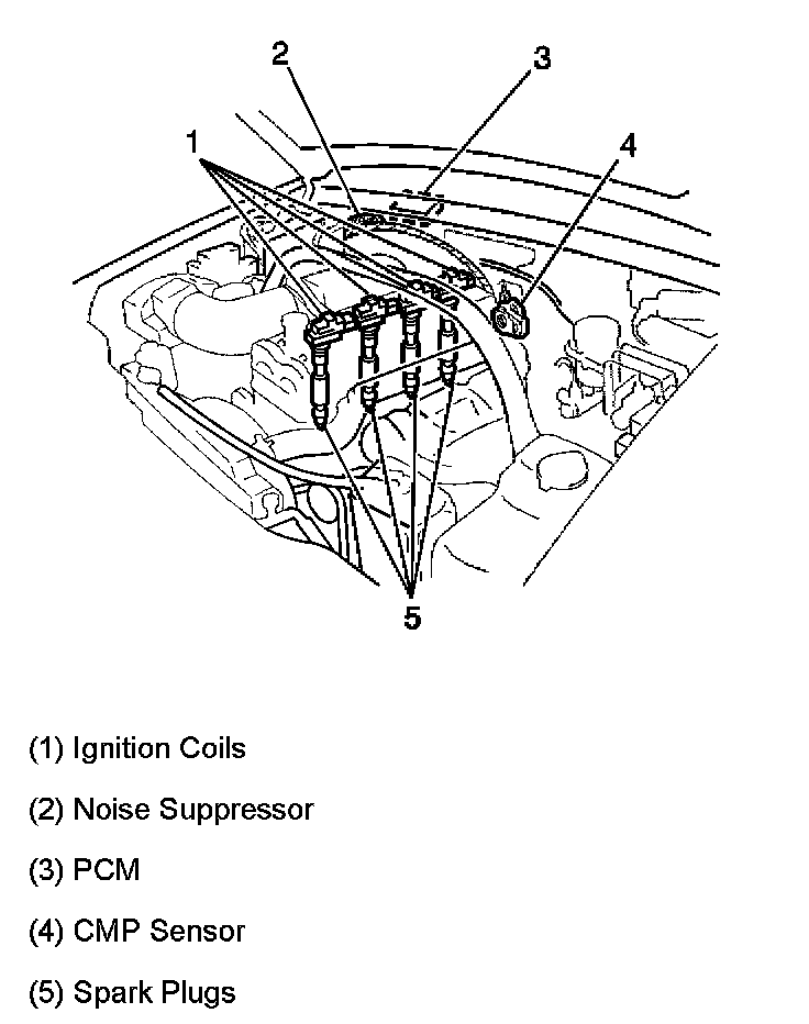 The ignition coil (2) has a high voltage output terminal and boot, that provides spark directly to the spark plug (3). Each ignition coil assembly has a built-in ignition module, or igniter, that controls the current flow in the primary coil winding. The secondary coil voltage travels directly to the spark plug, increasing secondary ignition voltage by eliminating the spark plug wire.