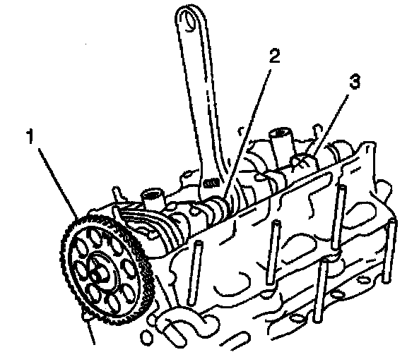 11. Remove the right primary timing chain camshaft sprocket bolt while holding the right intake camshaft (2) with a wrench.