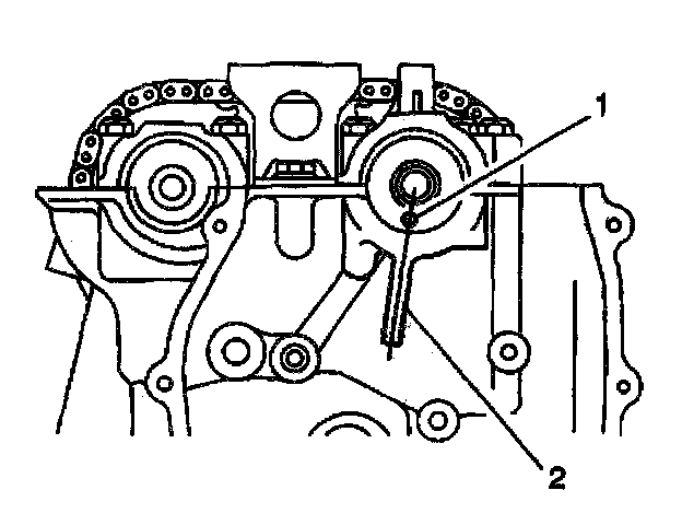 15. Verify that the latch (1) and teeth (2) of the timing chain tensioner adjuster are undamaged and that the tensioner functions correctly.
