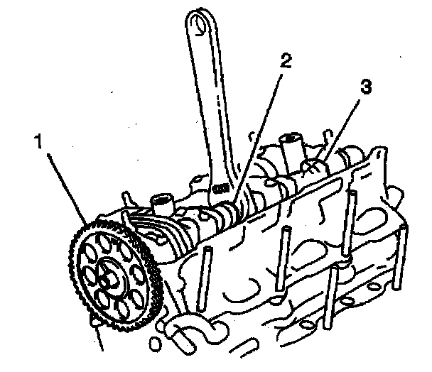5. Secure the sprocket (1) with the bolt while holding the intake camshaft (2) with a wrench.