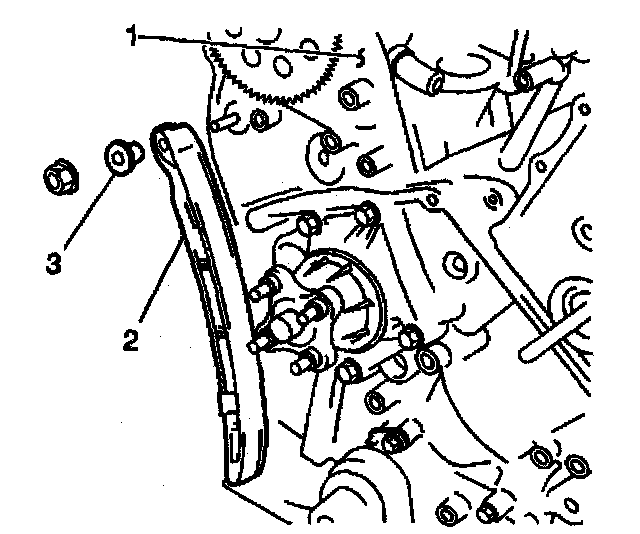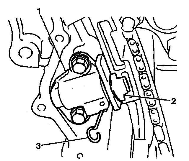 6. Install the timing chain tensioner (2). Secure with the nut.