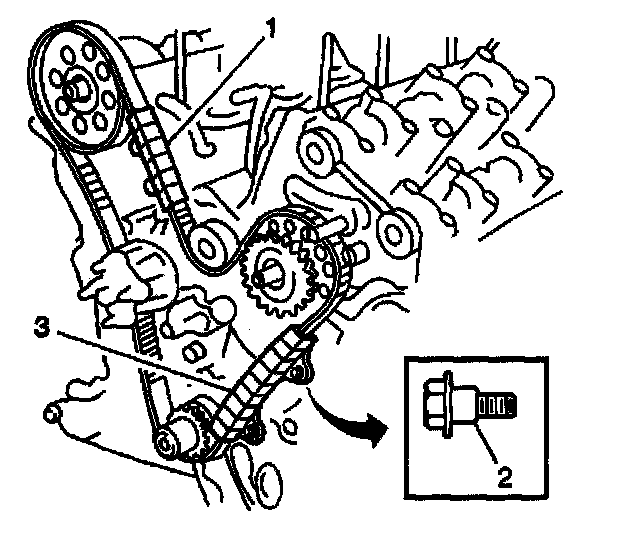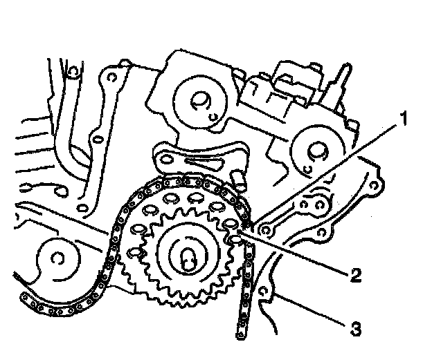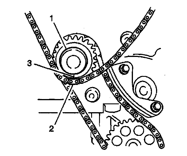 9. Install the primary timing chain to the crankshaft sprocket by aligning the yellow link (2) on the chain with the mark (3) on the sprocket.