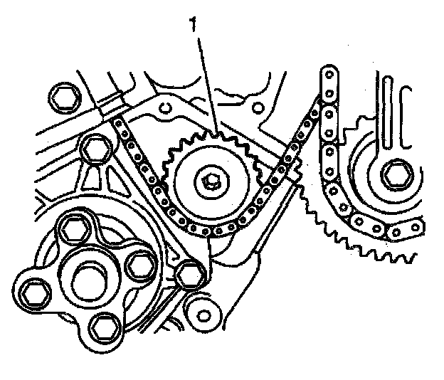 11. Install the primary timing chain to the idler sprocket (1) and secure the sprocket to the engine block with the bolt.
