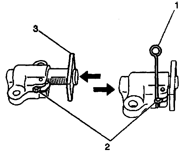 12. With the latch (2) of the tensioner adjuster returned and the plunger (3) pushed back into the body, insert a retainer (paper clip or similar tool) (1) into the set hole. After inserting the pin, make sure the plunger will not come out.