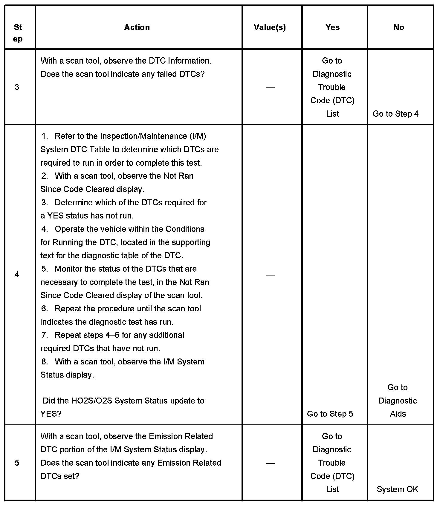 3. This step is to identify a first failure of a type B DTC. A DTC only appears on the I/M System Status display when it becomes a MIL illuminating DTC. This occurs on the second failure of a type B DTC. A first failure of a type B DTC will not allow the I/M System Status to update to YES. Refer to Diagnostic Aids.