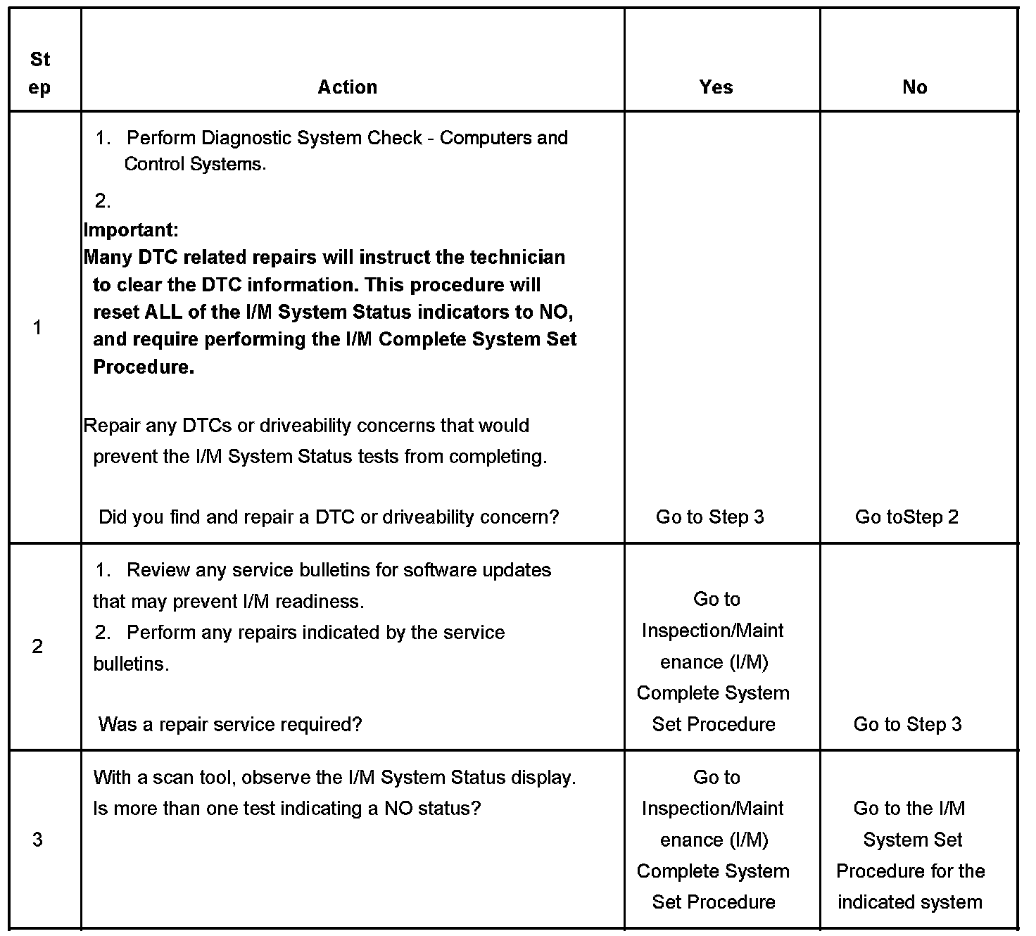1. Any DTCs set, even those that are not listed in the Inspection/Maintenance System DTC Table, may prevent the required DTCs from running. If there is any question as to whether a set DTC is disabling the required I/M diagnostic, review the Conditions for Running in the diagnostic procedures for the DTC required by the I/M diagnostic. A list of disabling DTCs, if applicable, is contained in the supporting text for that DTC.