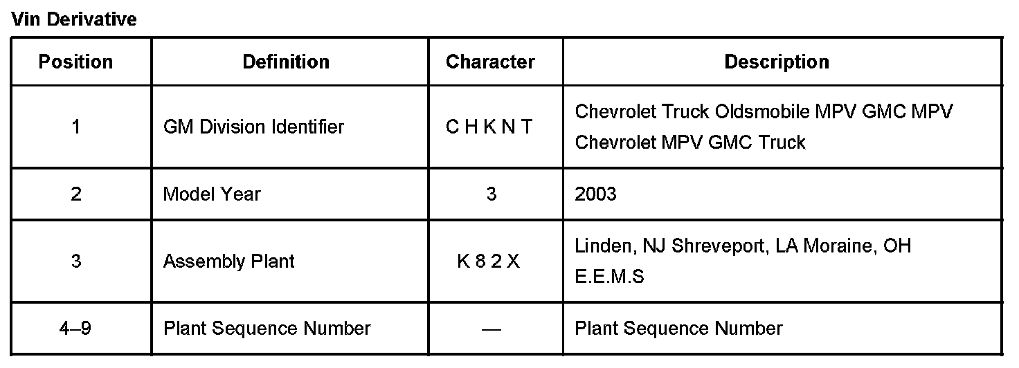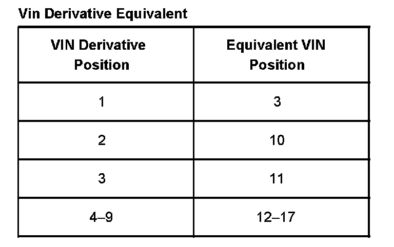 All engines and transmissions are stamped or laser etched with a partial Vehicle Identification Number (VIN), which was derived from the complete VIN. A VIN derivative contains the nine positions shown in the table above.