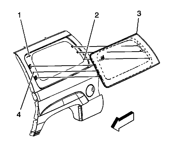 8. From the exterior of the vehicle, wearing safety gloves and goggles, pull the body side window outward and forward until the front body side window hinge releases from the window frame (2). Discard the body side window.