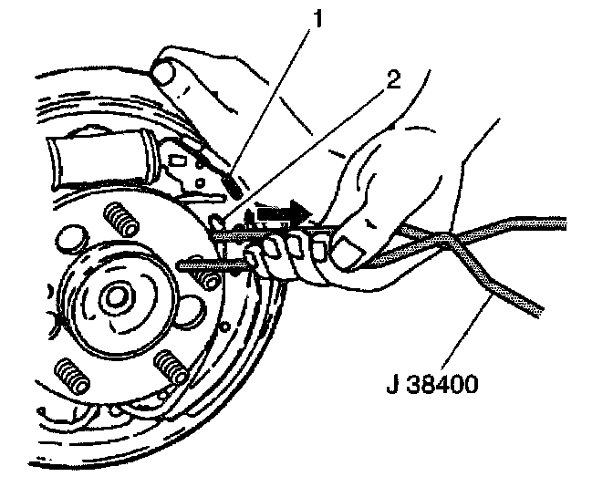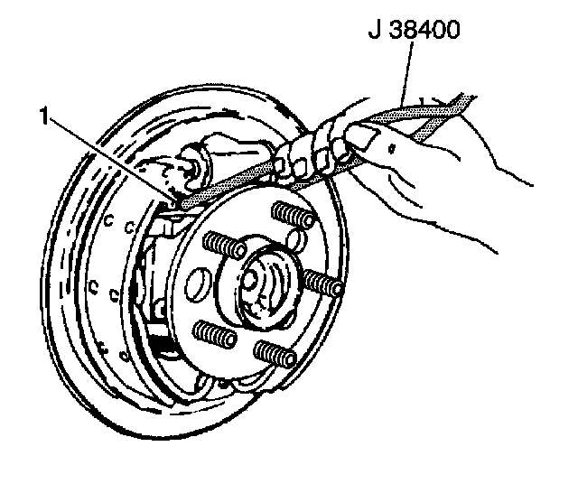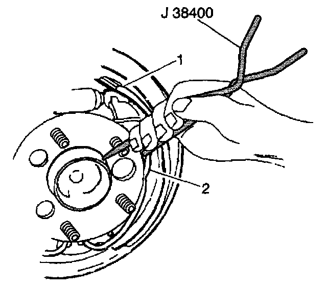 4. Remove the return spring (1). Use the J 38400 in order to pry the loop end of the adjuster spring from the adjuster actuator. Then disengage the adjuster spring from the web of the parking brake shoe.