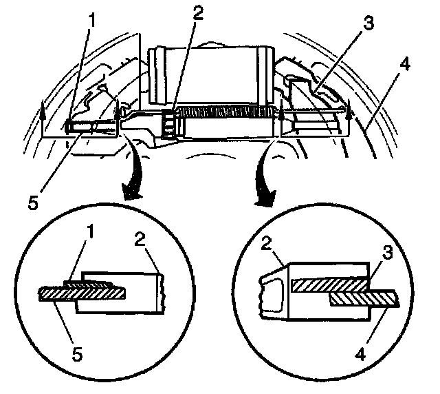5. Use the J 38400 in order to pull up the end of the universal spring (2), resting the return spring on the web of the brake shoe (1).