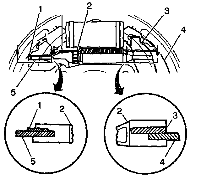 5. Remove the lift end of the universal spring (2) from the adjuster shoe and the lining (1).