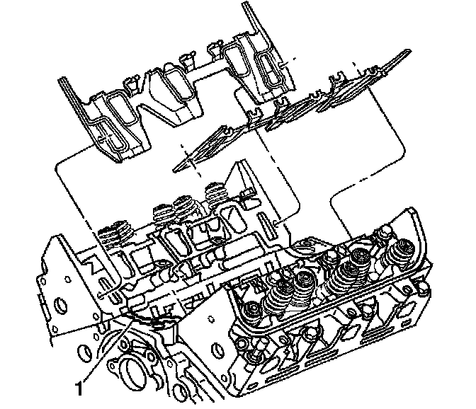 Note: Apply 8 - 12 mm (0.08 - 0.11 inch) bead of RTV Sealer GM P/N 12345739 or equivalent on each ridge where front and rear of the lower intake manifold contact the engine block (1).