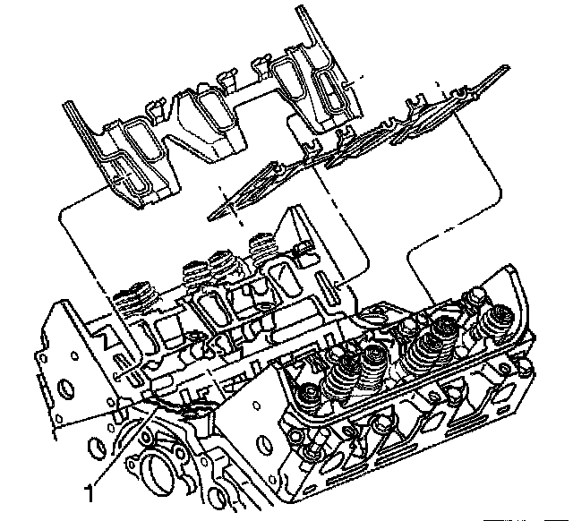 4. With gaskets in place apply a small drop 8-10 mm (0.31-0.39 in) of RTV sealer GM P/N 12346141 (Canadian P/N 89022195), or equivalent to the 4 corners of the intake manifold to block joint (1).