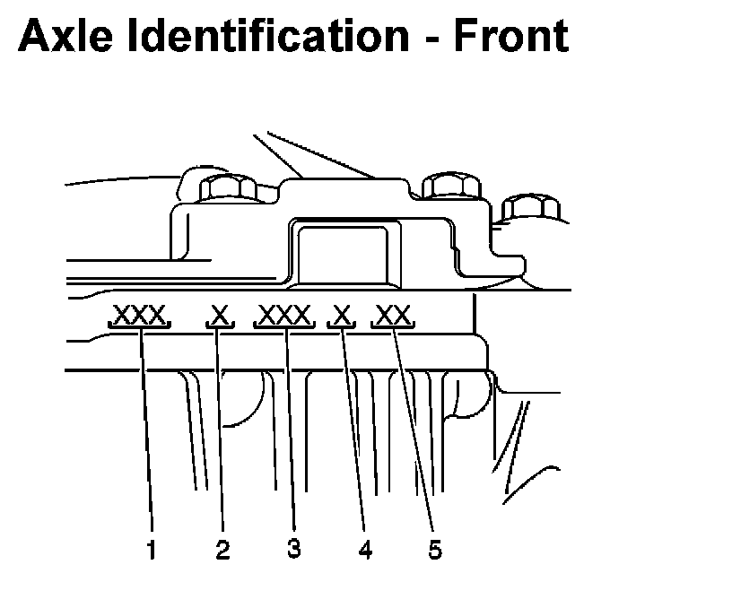 Front axle identification information is stamped on the top of the differential carrier assembly. The information includes the following: