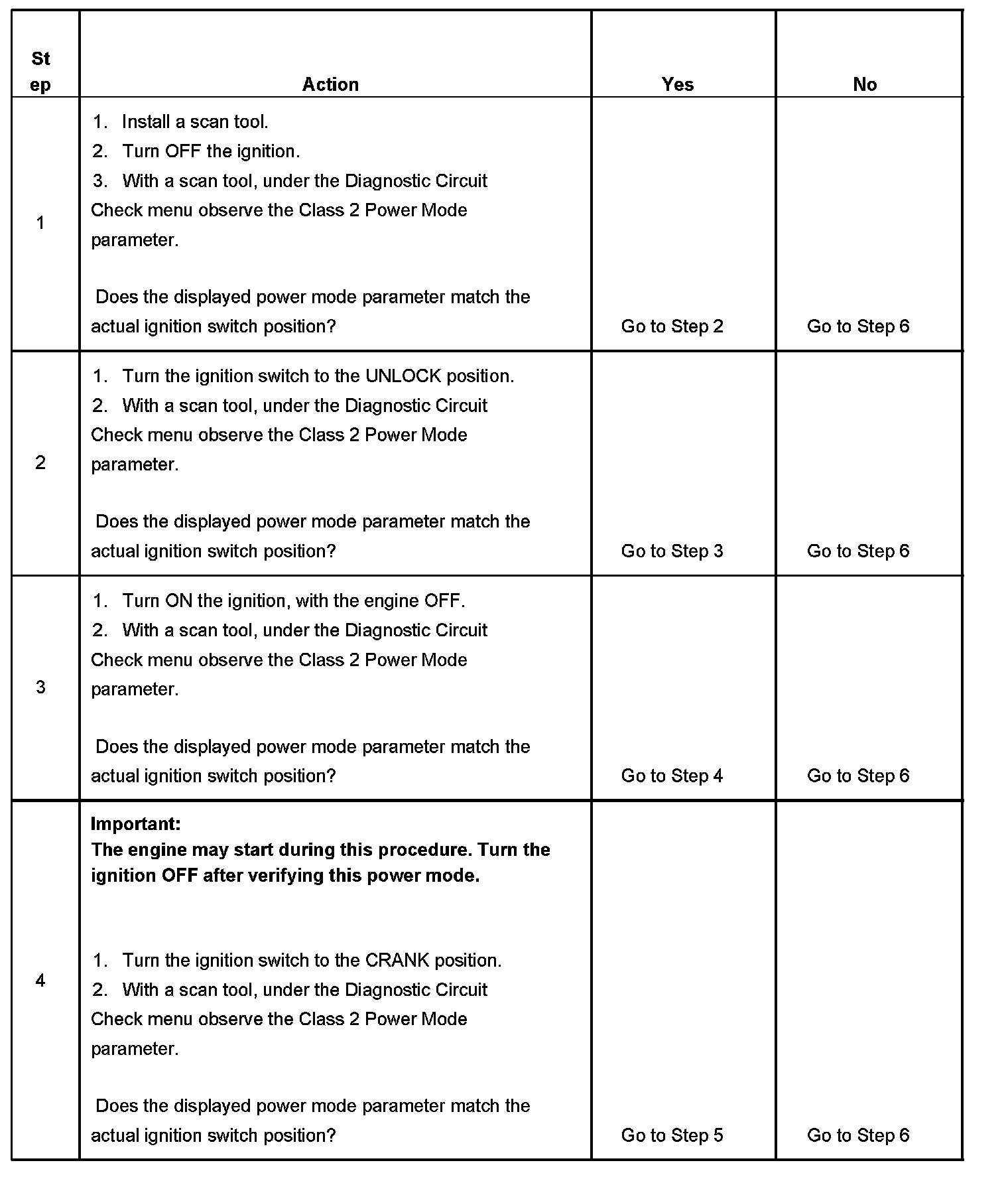 Normal vehicle class 2 communications and module operations will not begin until the system power mode has been identified. Discrete wires from the ignition switch contacts are monitored by the power mode master (PMM) module in order to determine the correct power mode. The PMM communicates the system power mode to all class 2 modules on the class 2 serial data line.