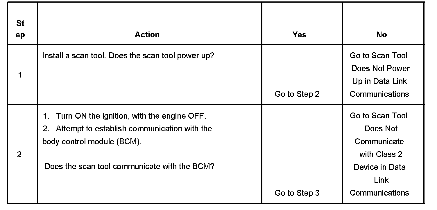 2. Lack of communication may be due to a partial malfunction of the class 2 serial data circuit or due to a total malfunction of the class 2 serial data circuit.The specified procedure will determine the particular condition.