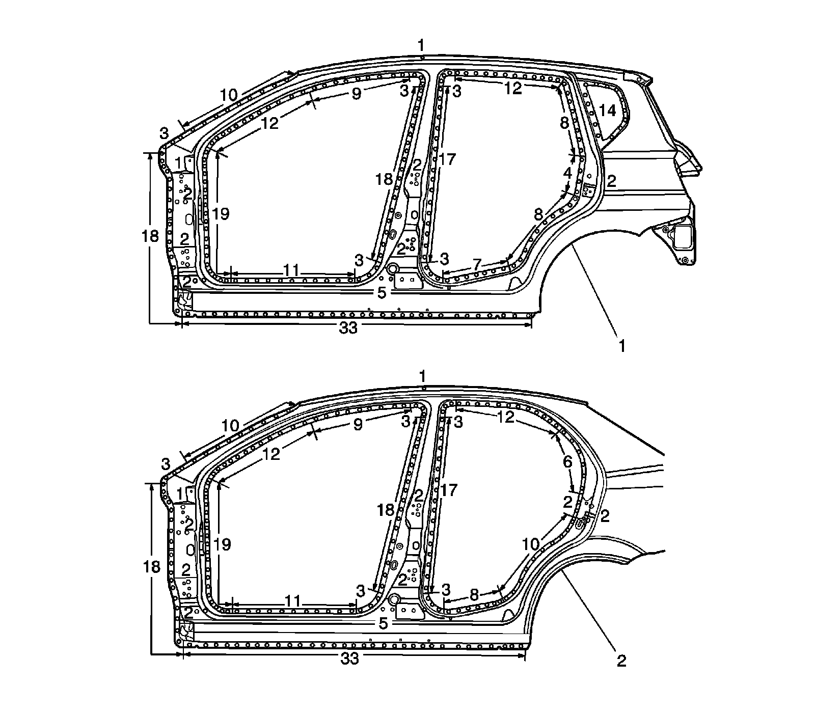 The frame door openings consist of frame door area and side outer area. It forms the base for the front, rear doors and other parts and maintains the rigidity of the doors and roof. The frame door opening area should, depending on the degree of damage, be repaired as much as possible rather than replaced. (Repair by pulling out)