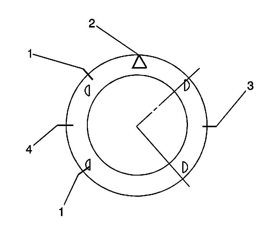16. Stagger the piston oil rings (3), the oil ring rail gaps (1), the second compression ring (4), and the top compression ring (3) in relation to the notch on the top of the piston (2).