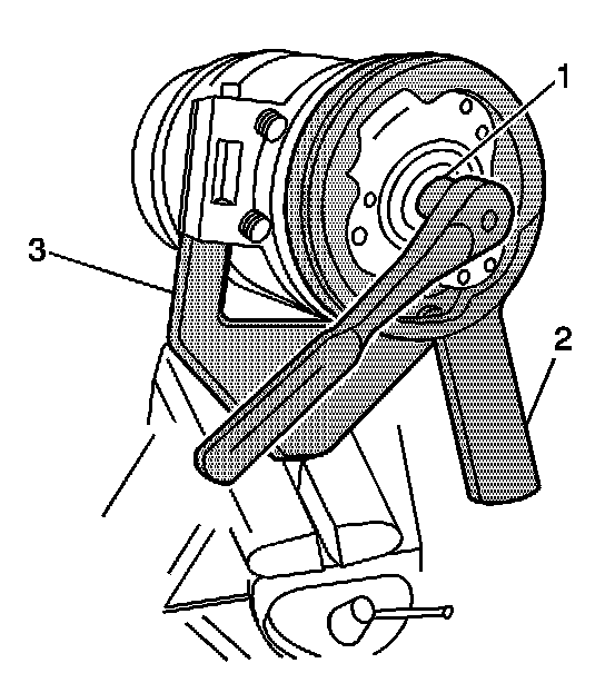 9. Install the shaft nut. Hold the clutch drive plate and the hub assembly with the J 33027-A (2). Use the J 33022 (1) and tighten the nut against the compressor shaft shoulder.
