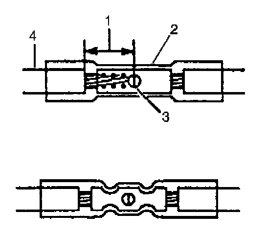 9. Insert the wires into the splice sleeve until the wire hits the barrel stop. The splice sleeve has a stop in the middle of the barrel in order to prevent the wire from passing through the splice (3).